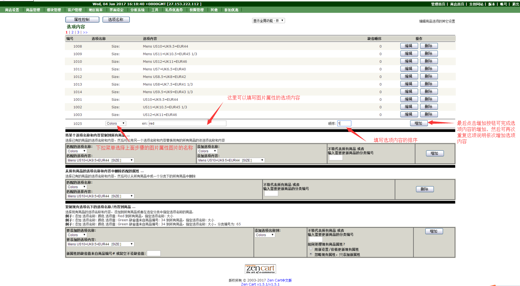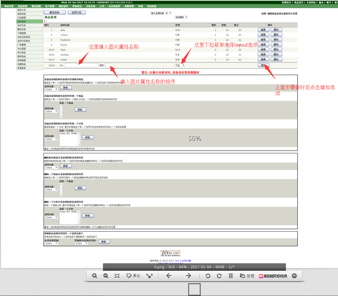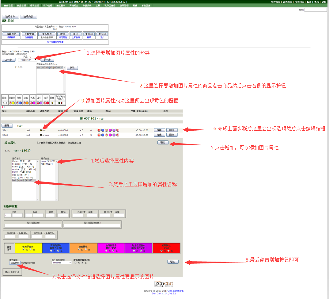 1.首先进入后台然后点击商品管理->选项名称如下图并按图中提示操作2.1.首先进入后台然后点击商品管理->选项内容如下图并按图中提示操作3.首先进入后台然后点击商品管理->属性控制如下图并按图中提示操作